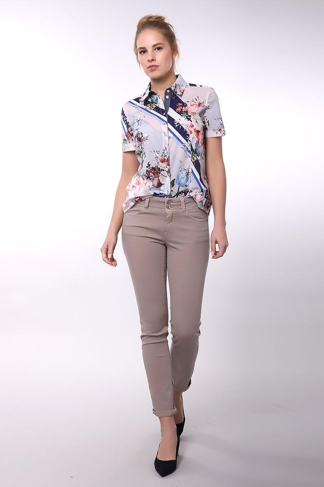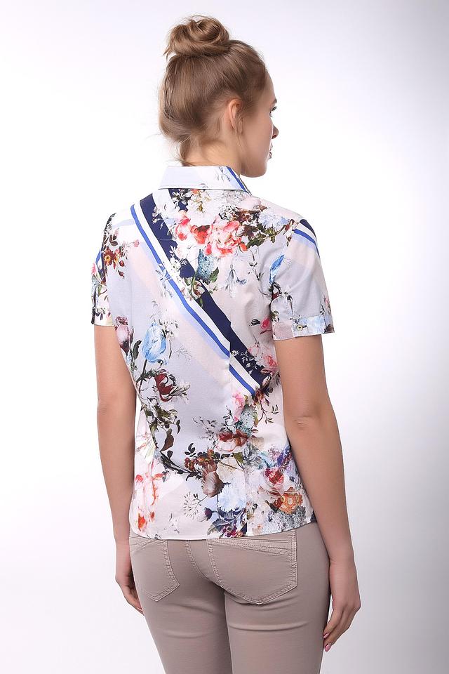 Особенностью данной модели является яркий цветочный принт, который придает ей женственности и легкости. Блуза имеет классический крой с короткими рукавами и отложным воротником. Застежка на пуговицы обеспечивает удобство надевания и снятия.