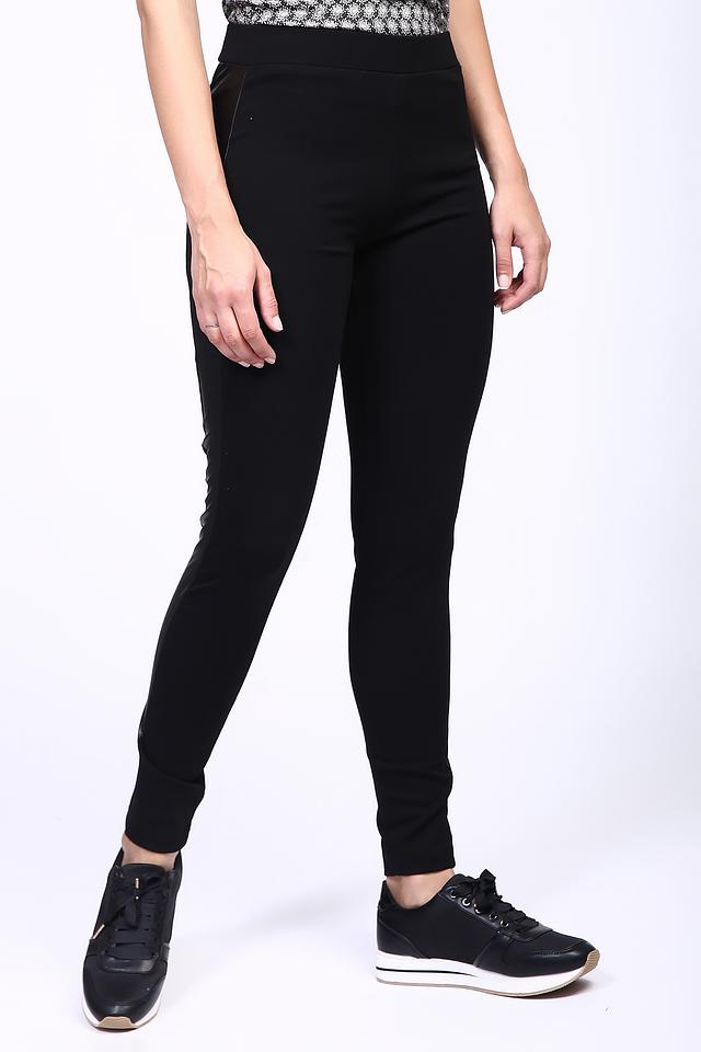 Брюки выполнены из мягкой и приятной к телу ткани, состоящей из вискозы, полиэстера и эластана. Эластан в составе обеспечивает комфортную посадку и свободу движений. Декоративные вставки из экокожи по бокам придают брюкам современный и стильный вид.