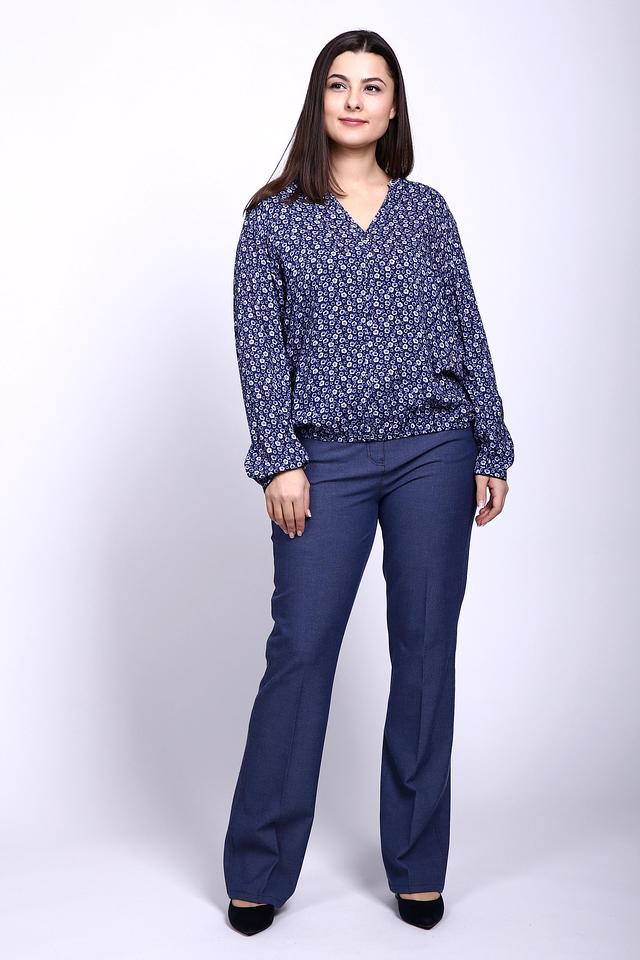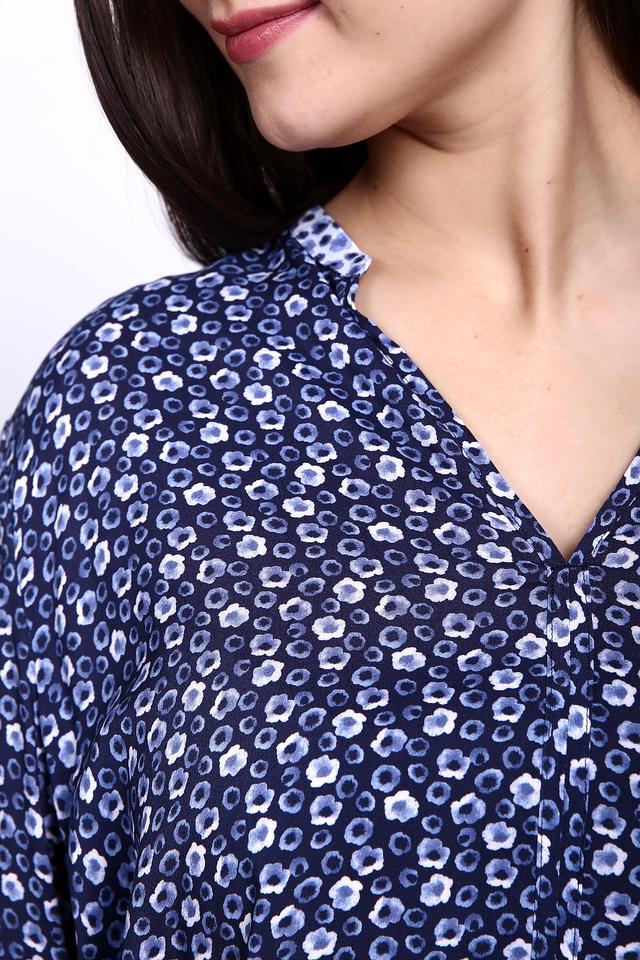 Универсальный синий цвет в сочетании с нежным цветочным принтом создает женственный и романтичный образ. Модель с V-образным вырезом и длинными рукавами прекрасно садится по фигуре, подчеркивая достоинства силуэта.