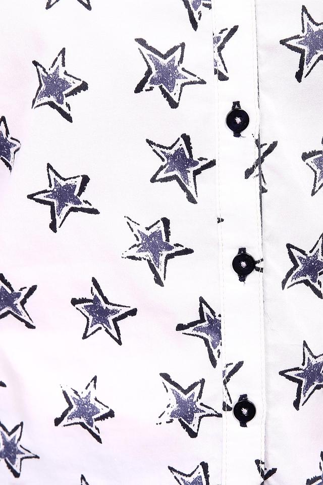 Основной цвет блузы – белый, а её поверхность украшена мелким узором из синих звёзд. Классический крой с длинными рукавами и отложным воротником делает эту модель универсальной и подходящей для различных случаев.