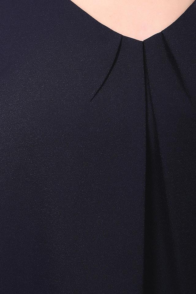 Блуза имеет V-образный вырез, который визуально удлиняет шею и придает образу женственность. Рукава длиной 3/4 делают ее подходящей для любого времени года. Спереди на груди расположены небольшие складки, добавляющие блузе объем и оригинальность.