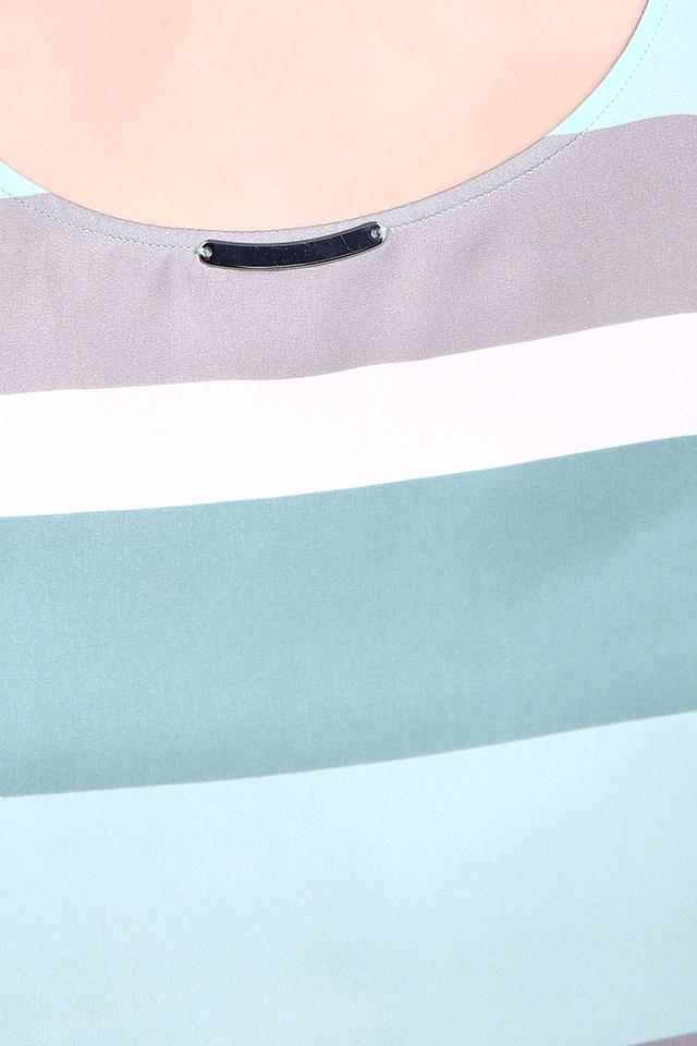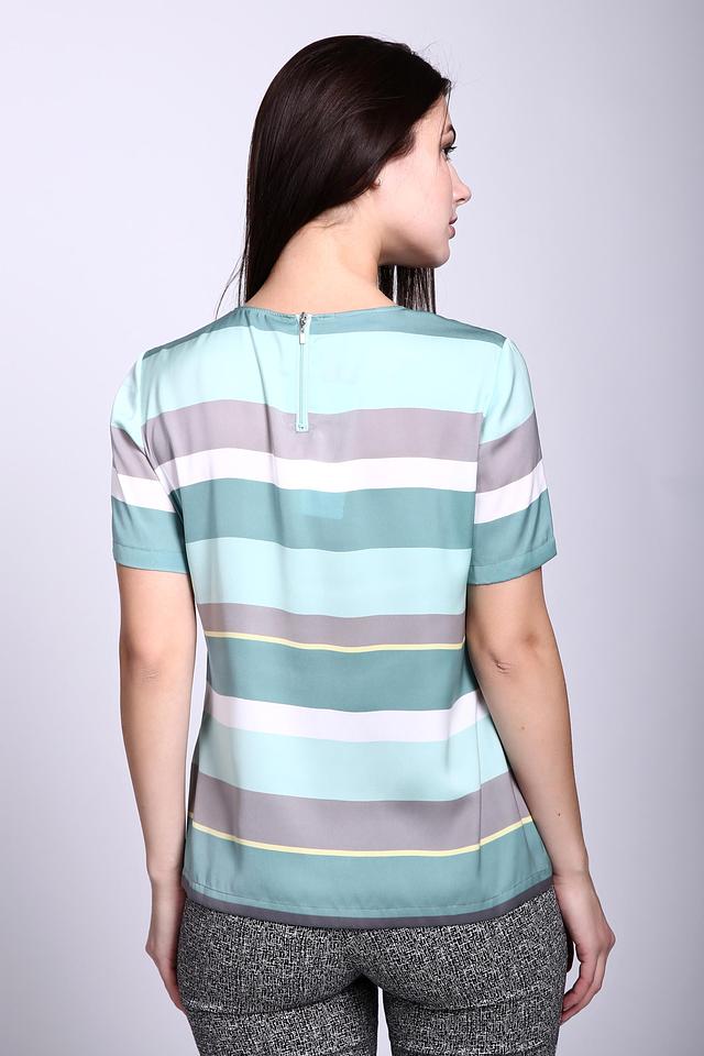 - Стильный дизайн. Модель украшена горизонтальными полосами в свежей цветовой гамме: бирюзовый, серый, белый и нежно-желтый. Этот дизайн придает блузе современный и непринужденный вид, легко сочетается с различными элементами гардероба.