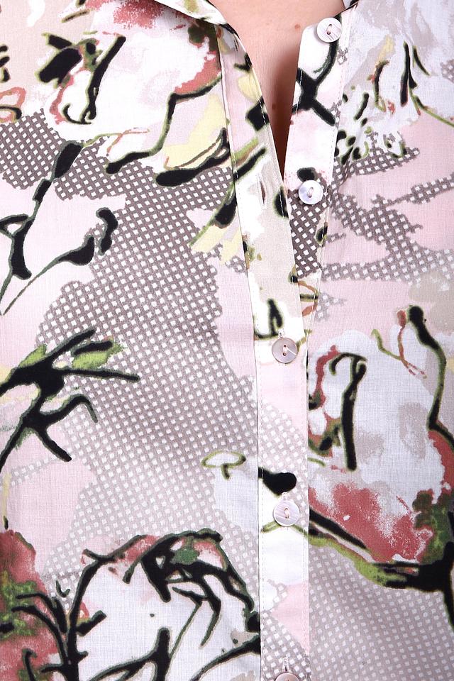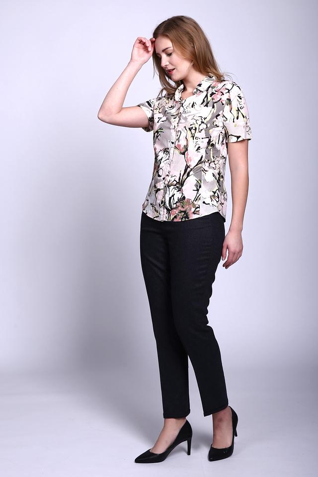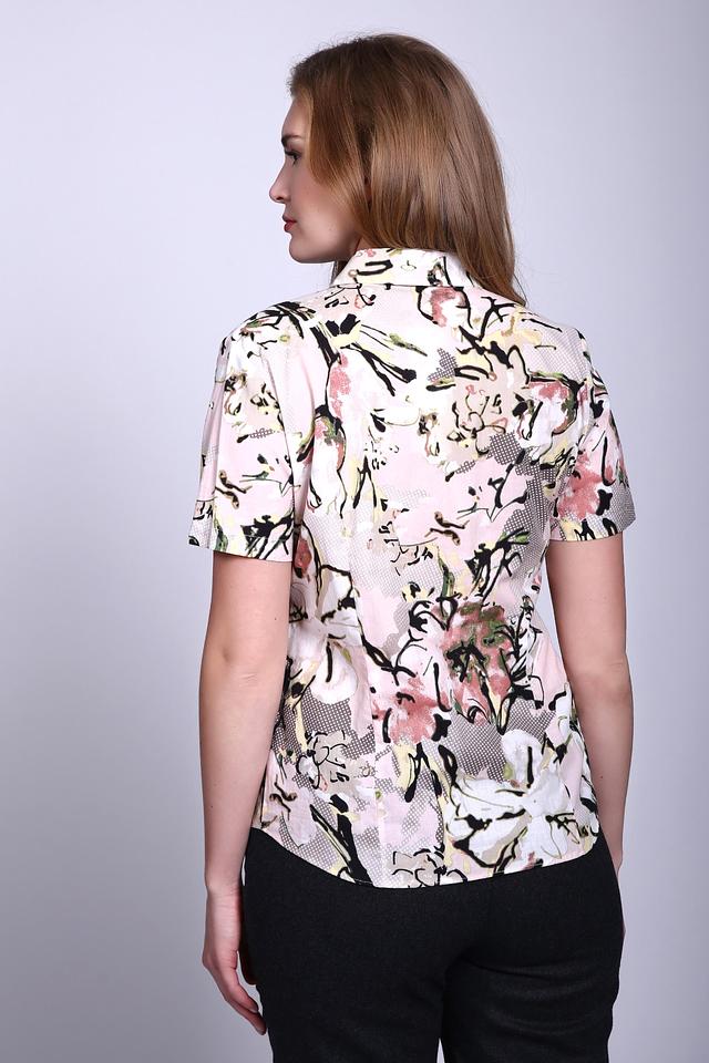 - Дизайн: Блузка выполнена в нежных тонах с цветочным принтом, придающим ей женственность и изысканность.