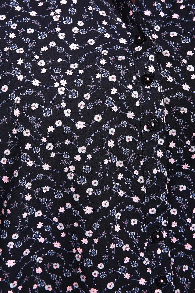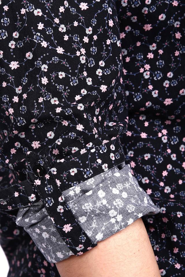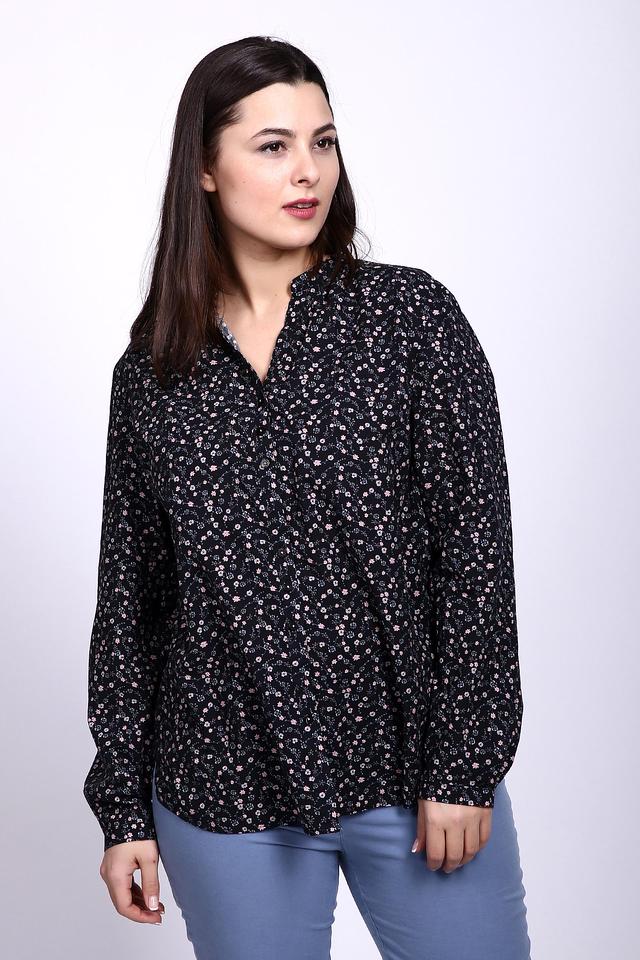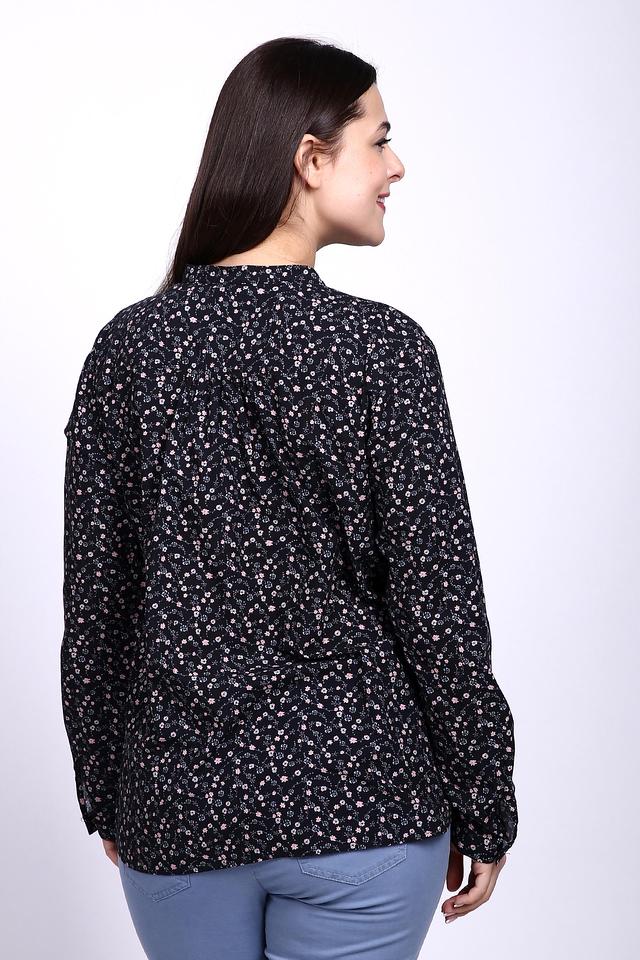 Основной цвет блузы – черный, который служит прекрасным фоном для нежного цветочного принта. Мелкие цветочные мотивы добавляют образу легкости и романтичности. Блуза имеет классический крой с V-образным вырезом и длинными рукавами, которые можно зафиксировать с помощью пуговиц.