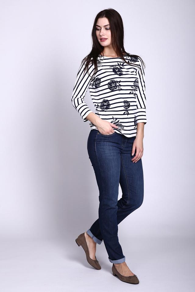Этот лонгслив от Gerry Weber станет прекрасным дополнением к вашему образу. Модель выполнена в классической полосатой расцветке, сочетающей в себе белый и насыщенный синий цвета. По всей поверхности изделия расположен принт с изображением цветов, добавляющий женственности и легкости.
