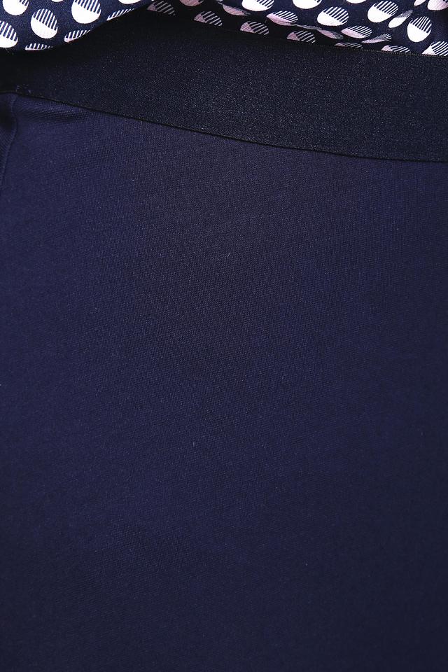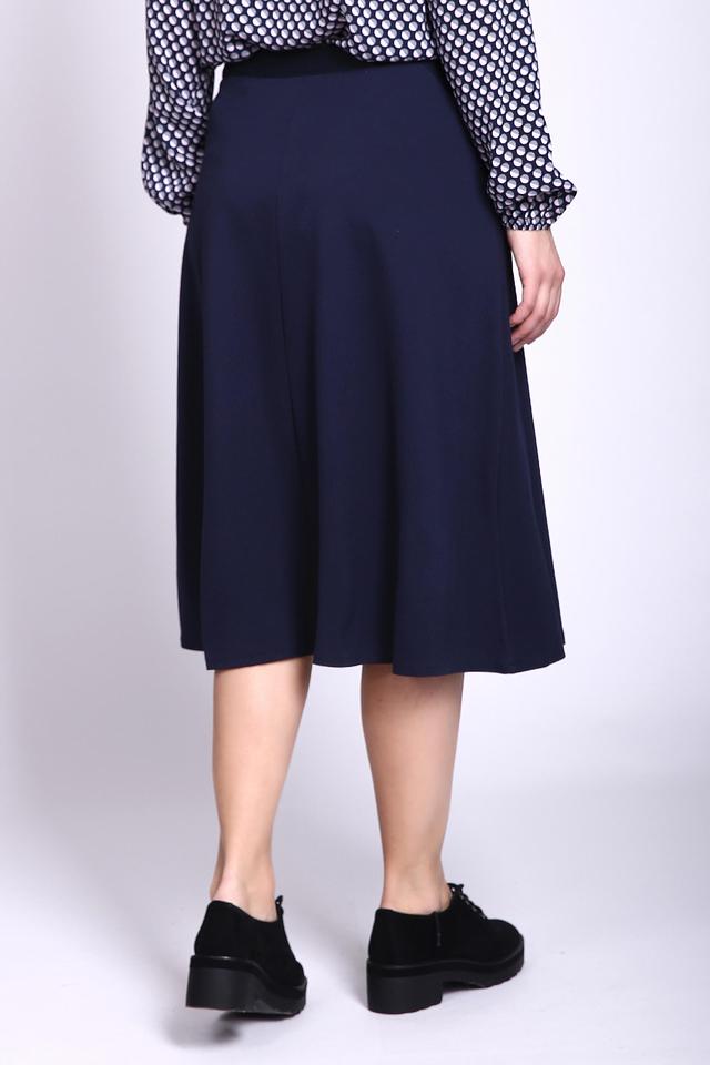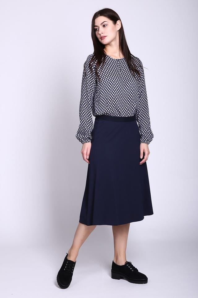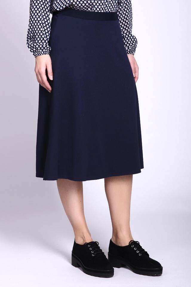 Модель имеет классический крой и длину миди, что делает ее универсальной и подходящей для различных типов фигур. Темно-синий цвет юбки позволяет легко сочетать ее с различными элементами гардероба, создавая разнообразные образы.
