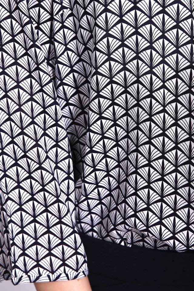 Блуза имеет свободный крой, который не сковывает движений. Округлый вырез горловины и рукава три четверти придают ей женственный вид. Привлекательный геометрический принт в чёрно-белой гамме делает эту блузу универсальной и подходящей для различных случаев.