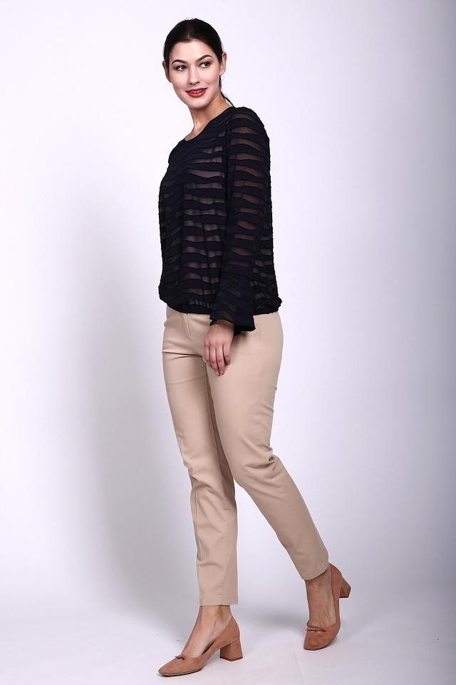 - Материал: Основной состав блузы – 100% полиэстер, обеспечивающий легкость и приятные тактильные ощущения. Тонкая структура ткани создает эффектный полупрозрачный вид.