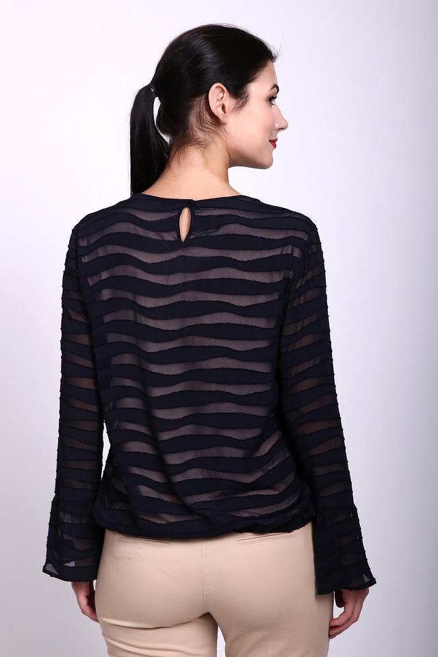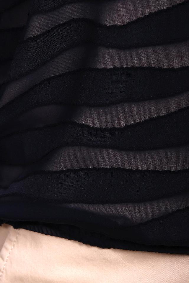 - Дизайн: Оригинальный волнистый принт, выполненный в технике наложения полос полупрозрачного материала, выглядит стильно и современно. Рукава слегка расклешенные, что добавляет образу романтичности.