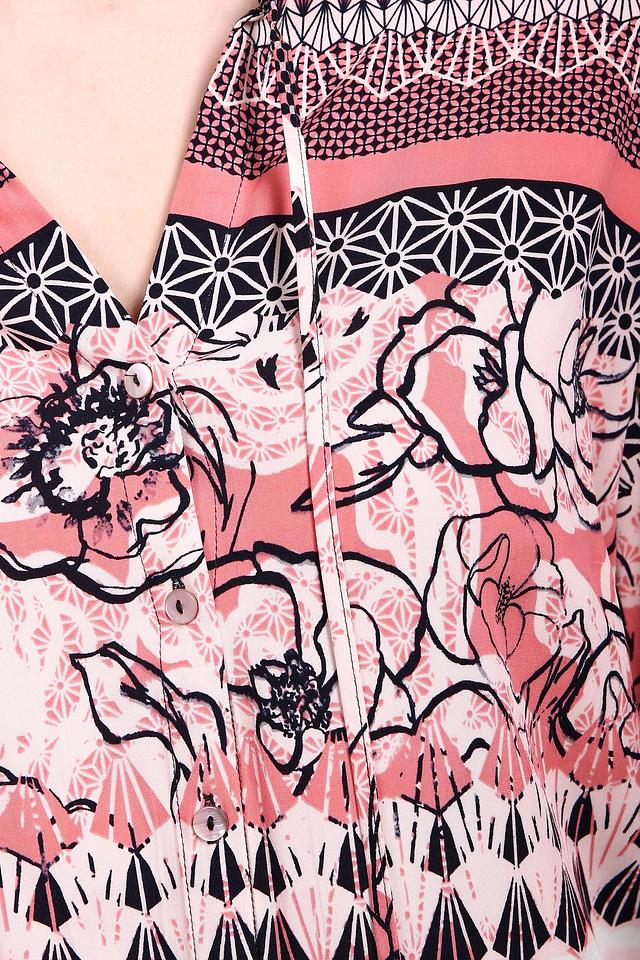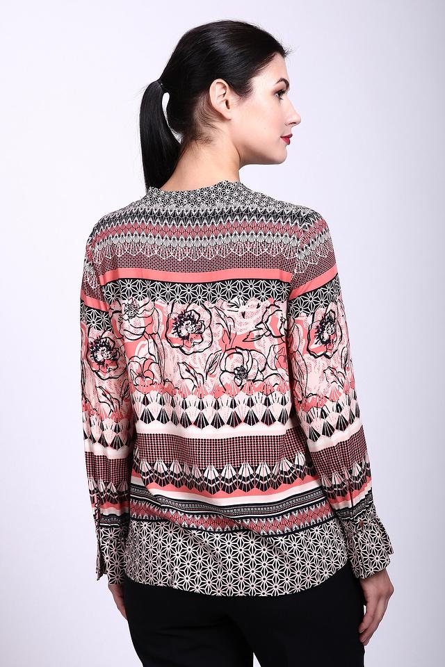 Особенностью данной модели является яркий и оригинальный принт с изображением цветов и узоров в коралловых, черных и белых тонах. Принт расположен по всей поверхности блузы, создавая неповторимый визуальный эффект.