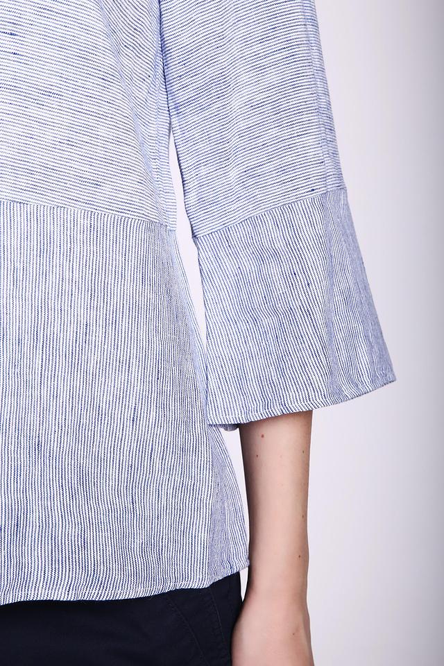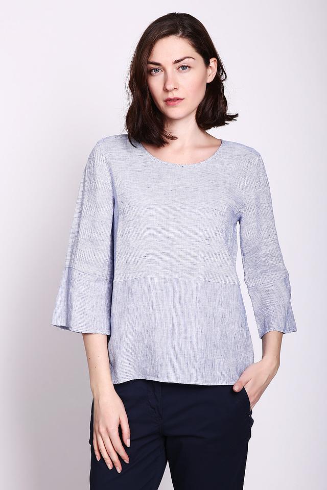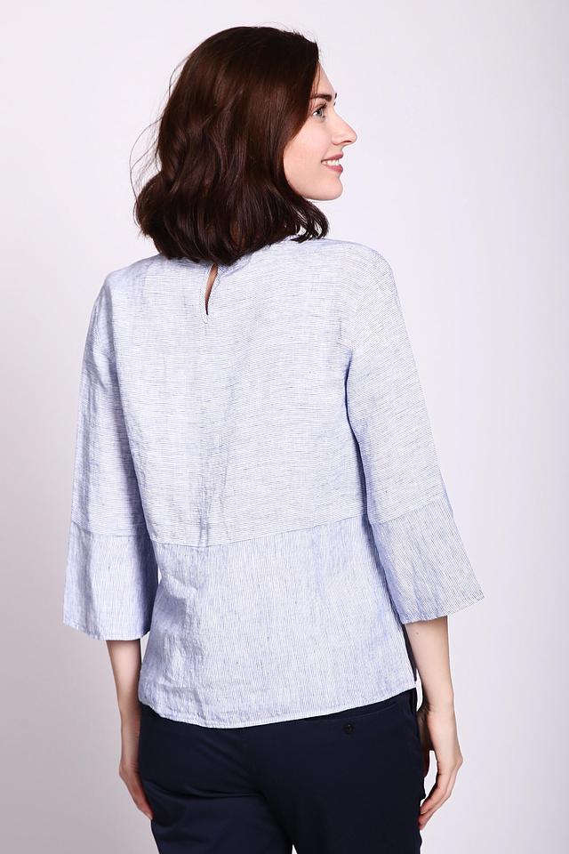 Блуза имеет свободный крой, который не сковывает движений и позволяет коже дышать. Рукава длиной 3/4 с лёгким расклешением добавляют образу женственности и лёгкости. Голубая полоска придает блузе свежий и непринужденный вид.