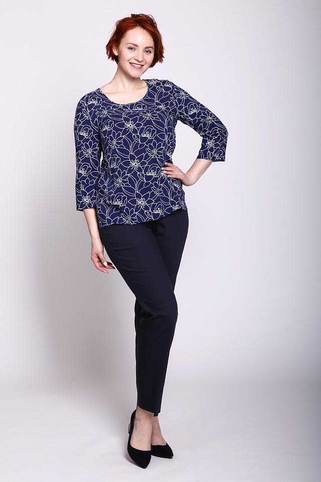 Блуза женская синего цвета от бренда Gerry Weber. Модель выполнена прямым фасоном. Изделие дополнено округлым воротом, втачными рукавами 3/4 длины. Ткань блузы имеет принт. Состав ткани: 100% вискоза. Сочетать можно с различными брюками.