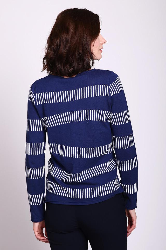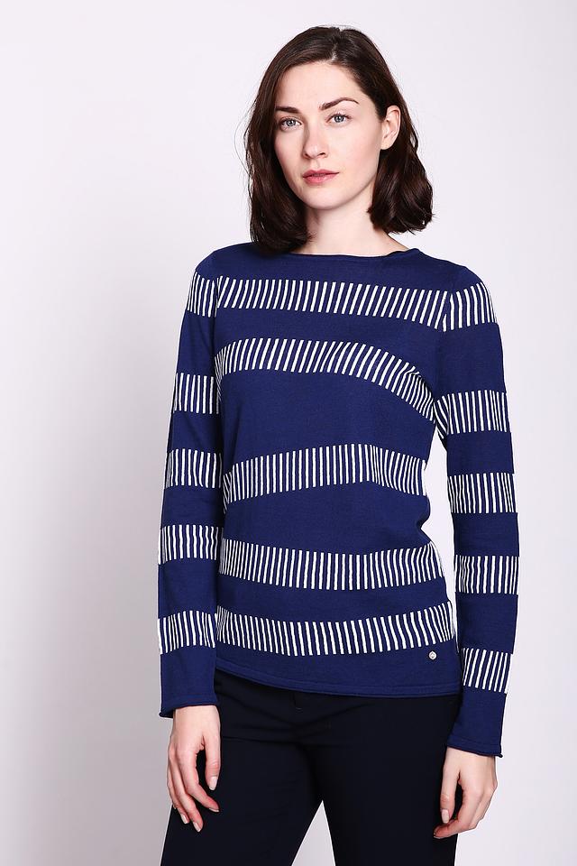 Этот стильный пуловер от Gerry Weber выполнен в насыщенном синем цвете и украшен выразительным полосатым рисунком. Модель имеет классический крой с длинными рукавами и круглым вырезом горловины.