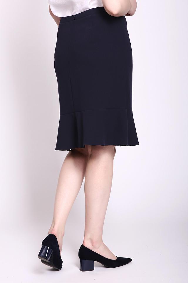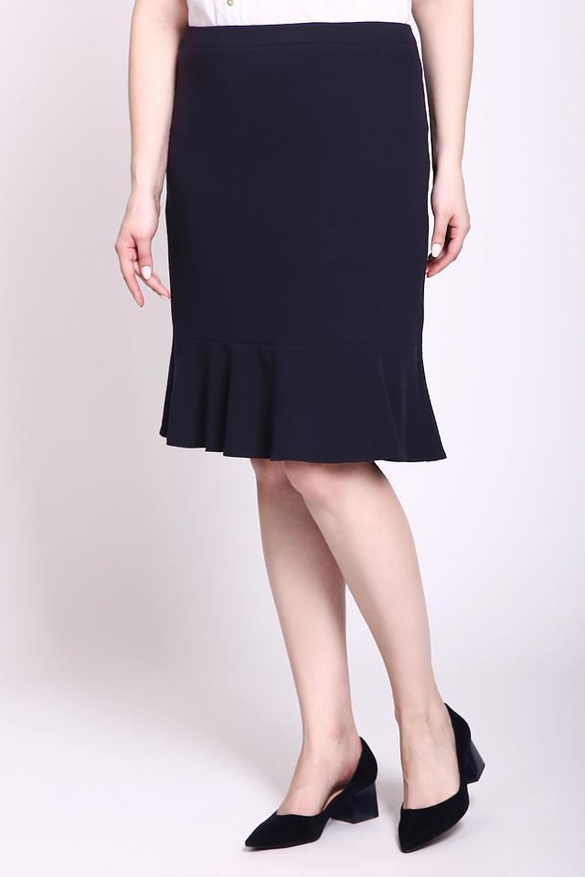 Юбка имеет приталенный силуэт и длину до колена, что делает ее универсальной для различных случаев. Особенностью модели является изящная оборка по низу, которая придает ей женственность и легкость.