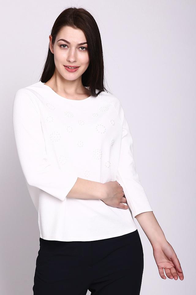 Изделие выполнено из высококачественного полиэстера (96%) с добавлением эластана (4%), что обеспечивает комфорт, износостойкость и легкий уход. Поверхность ткани украшена изящными декоративными жемчужными элементами, расположенными в виде аккуратных узоров, придающих блузке особую нарядность.