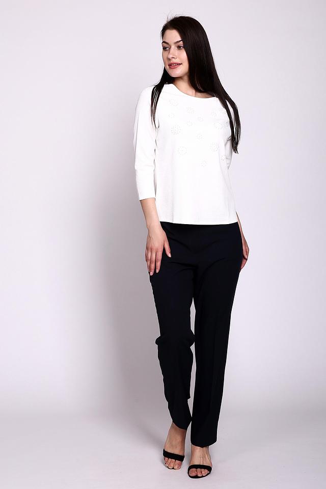 - Изысканный декор: Лицевая часть блузки украшена мелкими жемчужными бусинами, формирующими нежные цветочные узоры. Этот деликатный акцент придает модели шарм и уникальность, выделяя ее среди других блузок.