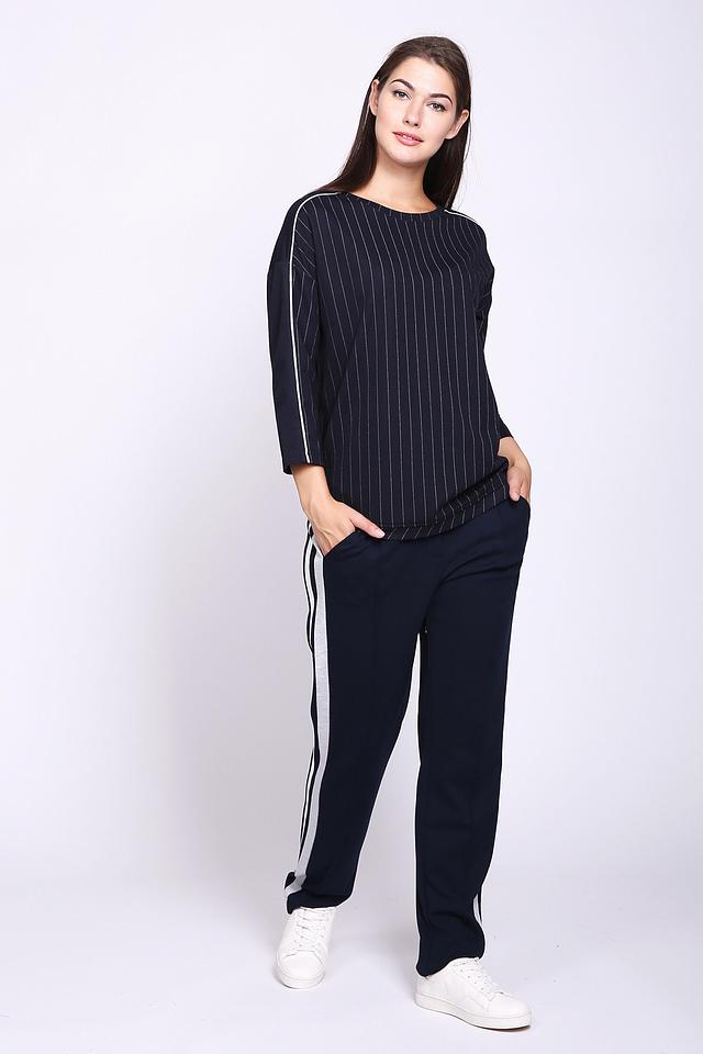 Пуловер имеет прямой крой и длину до бедер, что делает его универсальным для различных типов фигур. Вертикальная полоска визуально вытягивает силуэт, а округлый вырез горловины придает образу женственность.