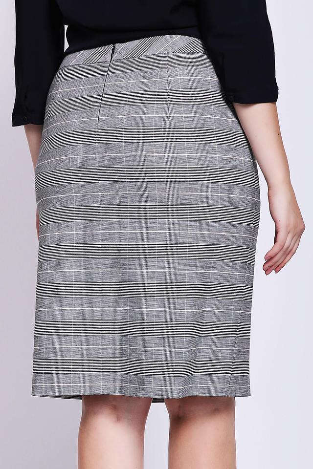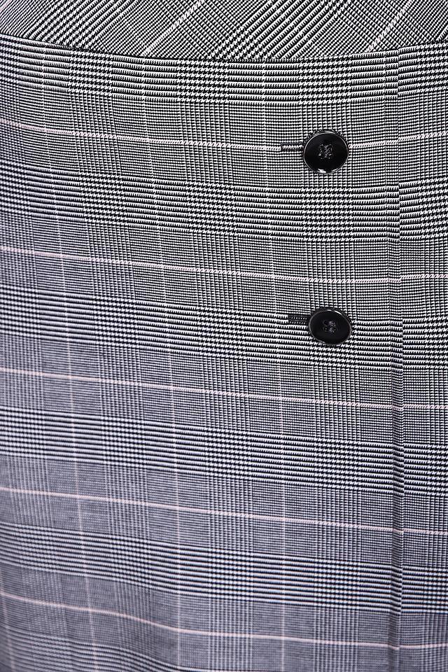 Юбка застёгивается на две пуговицы, что добавляет ей элегантности и позволяет регулировать посадку по фигуре. Ткань юбки содержит полиэстер, хлопок и эластан, что обеспечивает ей приятные тактильные ощущения, хорошую форму и лёгкость в уходе.