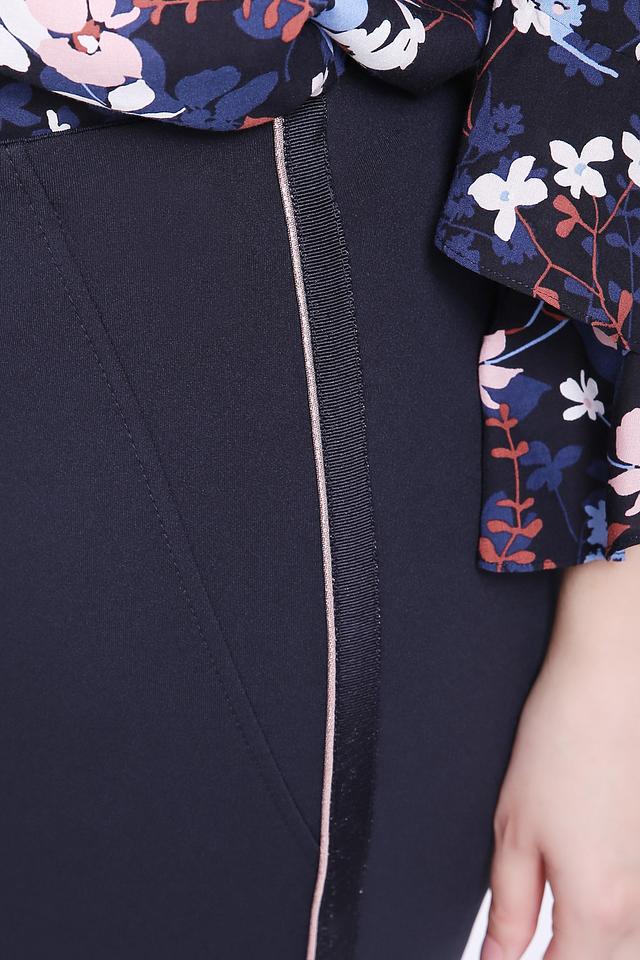 Особенностью модели является контрастная белая полоса, проходящая вдоль боковых швов, что придает брюкам современный и стильный вид. Прямой крой обеспечивает комфортную посадку по фигуре, а эластичный материал позволяет свободно двигаться в течение дня.