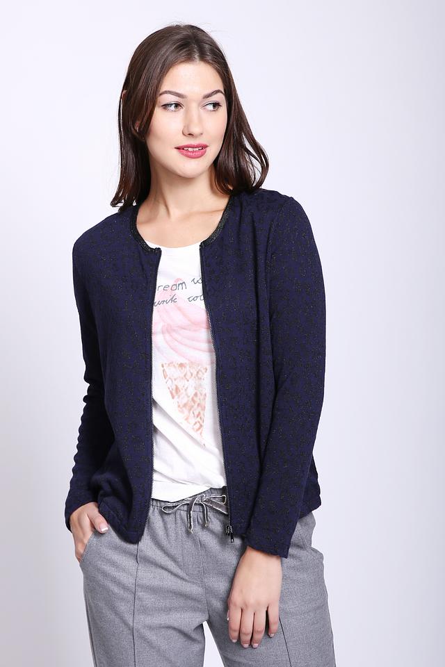 Жакет Gerry Weber темно-синего цвета с деликатным блестящим узором станет стильным дополнением к вашему гардеробу. Модель на молнии с длинными рукавами и округлым вырезом горловины. Состав: хлопок 74%, полиэстер 26%