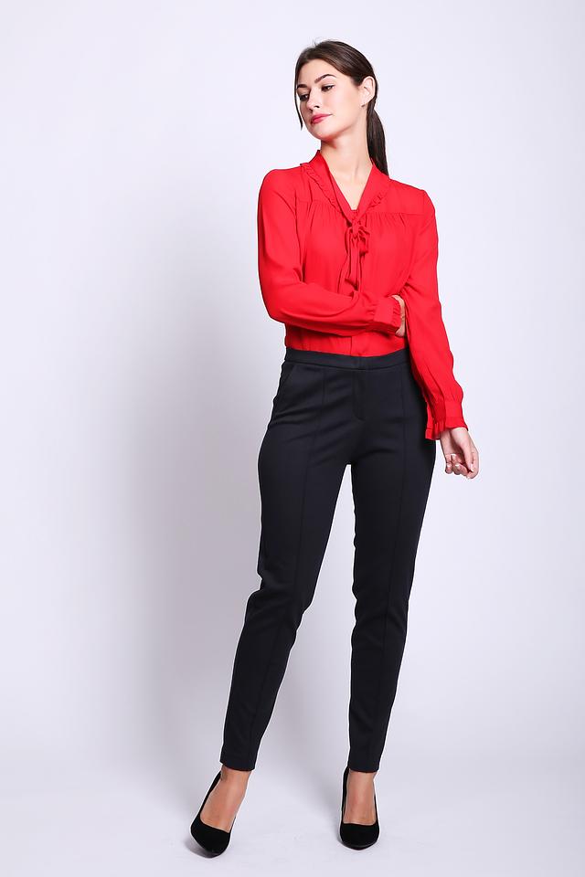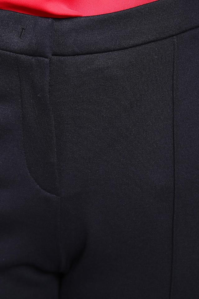 Брюки имеют высокую посадку и эластичный пояс, обеспечивающие комфортную посадку по фигуре. Ткань, состоящая из вискозы, полиамида и эластана, приятна к телу и хорошо держит форму.