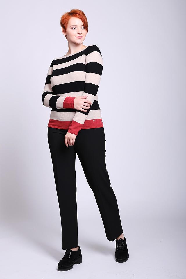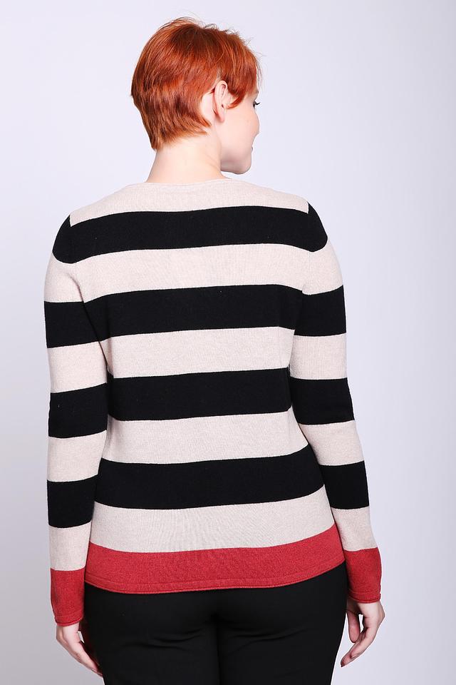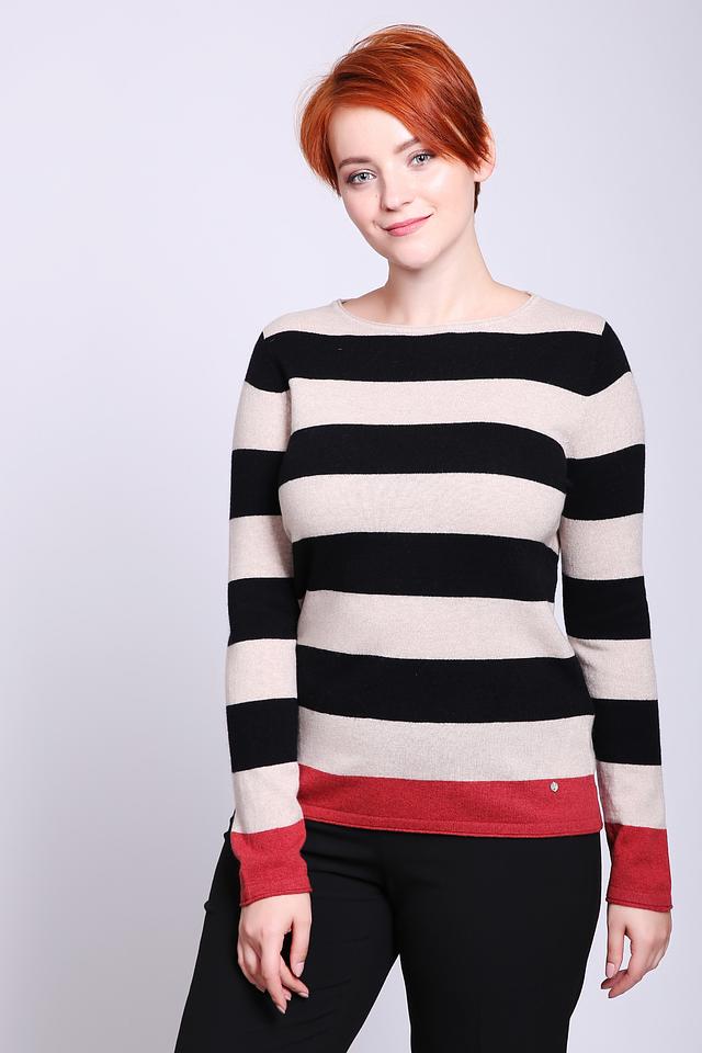 Этот элегантный пуловер от Gerry Weber станет прекрасным дополнением к вашему гардеробу. Пуловер выполнен в классическом стиле с горизонтальными полосами бежевого, чёрного и белого цветов, что делает его универсальным и подходящим для различных образов.