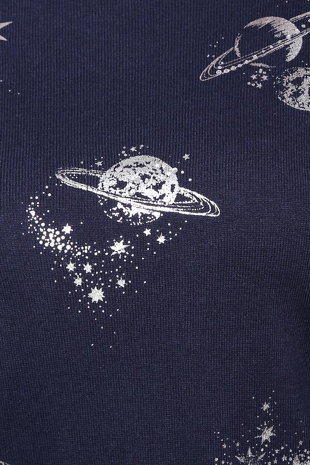 Пуловер имеет классический крой с длинными рукавами и круглым вырезом горловины. Его глубокий синий цвет служит идеальным фоном для оригинального принта с изображением планет, звёзд и космических элементов, выполненного в серебристых тонах.