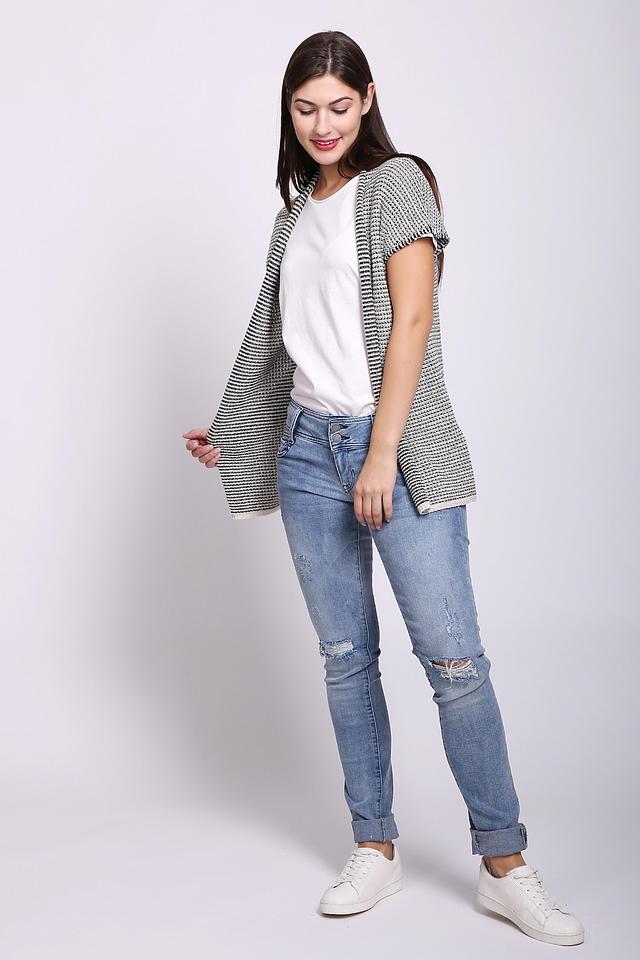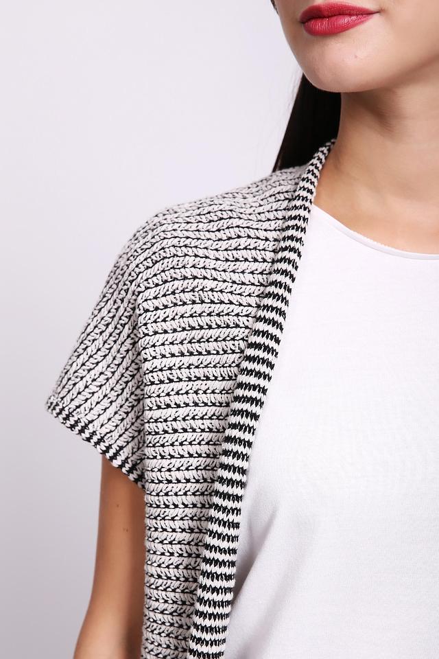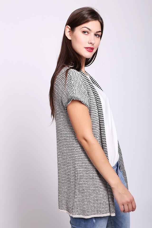 Женский жилет Gerry Weber чёрно-белого цвета с короткими рукавами выполнен из хлопкового трикотажа. Модель имеет открытый силуэт и фактурную вязку, идеально подходит для создания многослойных образов. Состав: хлопок 75%, полиамид 25%