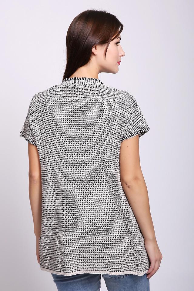 Жилет имеет короткие рукава и свободный крой, что обеспечивает комфорт в носке. Фактурная вязка придает изделию особый шарм и делает его интересным акцентом в образе.