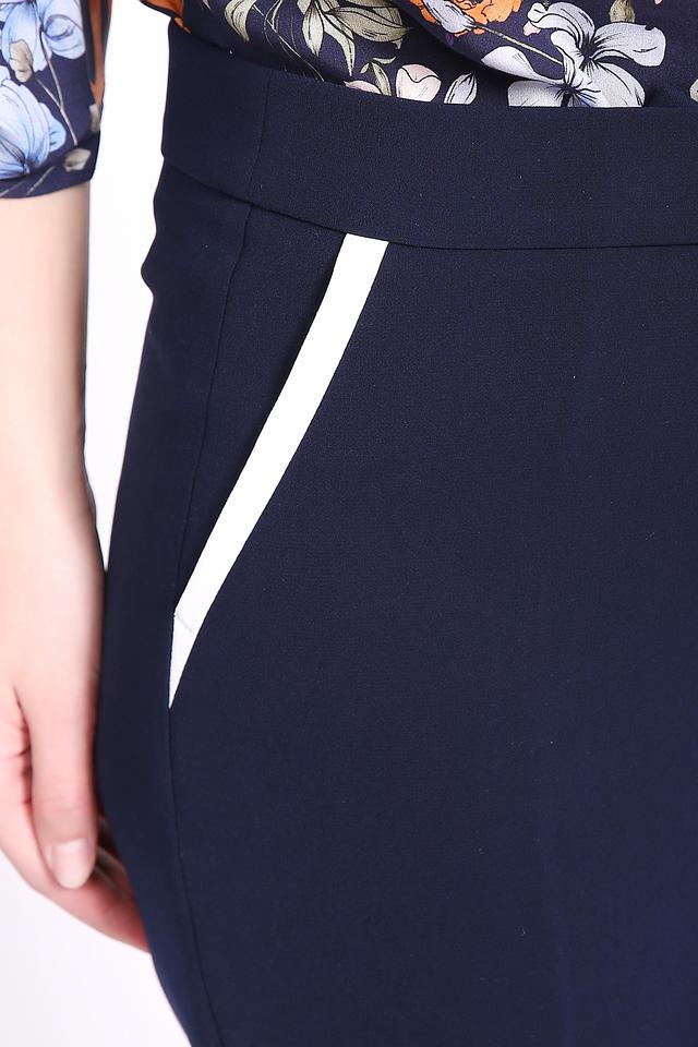 Брюки имеют прямой крой и стандартную посадку по фигуре, что обеспечивает комфорт в носке. Основной цвет – насыщенный темно-синий, который легко сочетается с различными элементами гардероба. Оригинальной деталью является контрастная белая полоса, проходящая вдоль боковой части брюк, добавляющая образу динамичности.