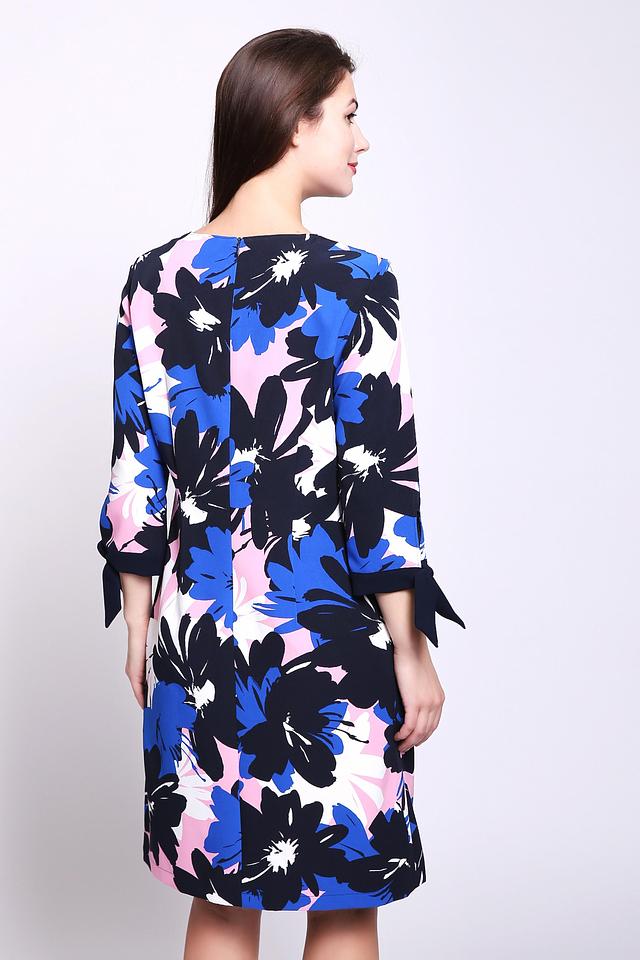 Модель имеет прямой силуэт, длину до колена и удобный круглый вырез горловины. Короткие рукава дополнены небольшими завязками, которые можно регулировать по желанию. Платье изготовлено из полиэстера с добавлением эластана, что обеспечивает комфортную посадку по фигуре и легкость в уходе.