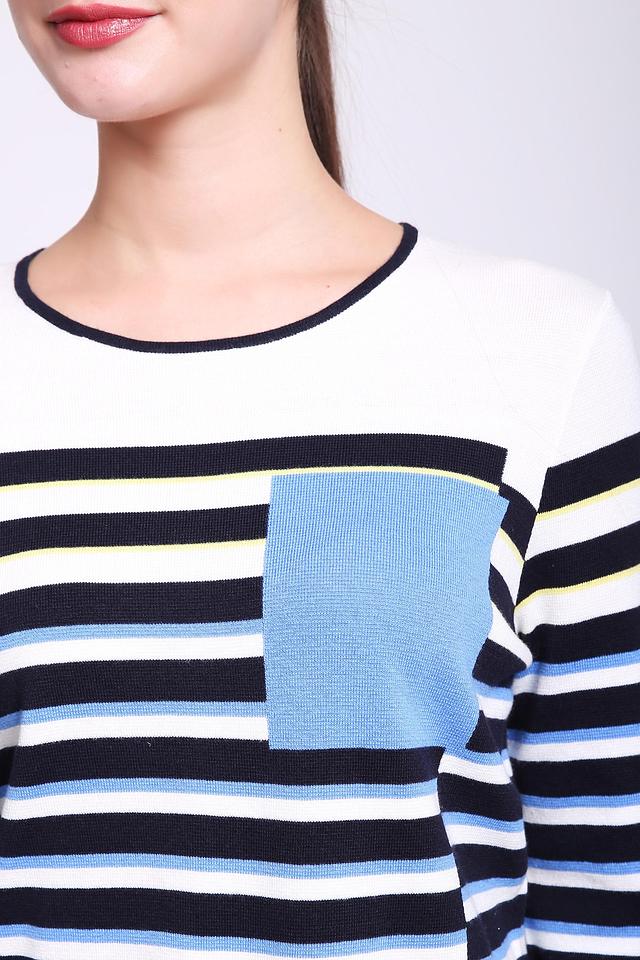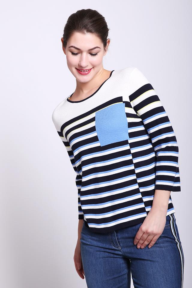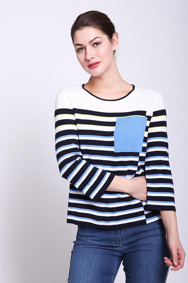 Женский пуловер Gerry Weber синего цвета с классическим полосатым принтом и накладным карманом. Модель выполнена из мягкого трикотажа с добавлением вискозы, хлопка и шелка для комфорта и приятных тактильных ощущений. Состав: вискоза 50%, хлопок 40%, шелк 10%