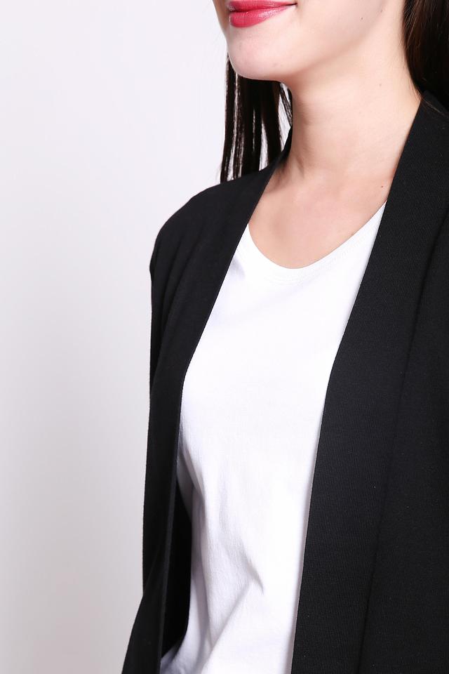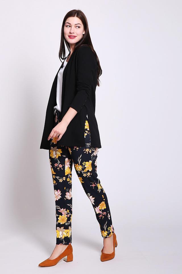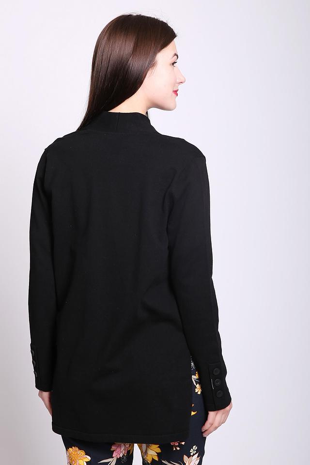 Жакет имеет V-образный вырез, который визуально удлиняет шею и делает силуэт более изящным. Длинные рукава и свободный крой обеспечивают комфорт в носке. Боковые разрезы добавляют динамики и лёгкости.