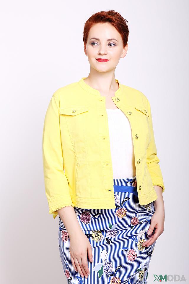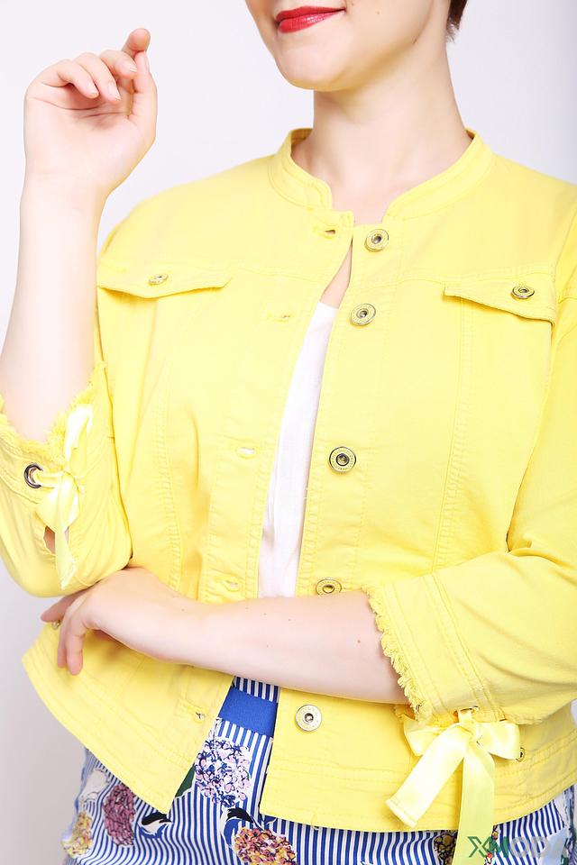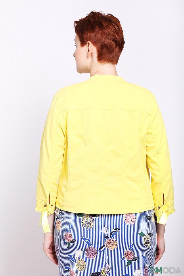 Жёлтый жакет Gerry Weber – стильная и лёгкая модель с застёжкой на пуговицы и декоративными бантиками на рукавах. Жакет выполнен из хлопка с добавлением эластомера и эластана, что обеспечивает комфорт и удобство в носке. Состав: хлопок 89%, эластомер 9%, эластан 2%