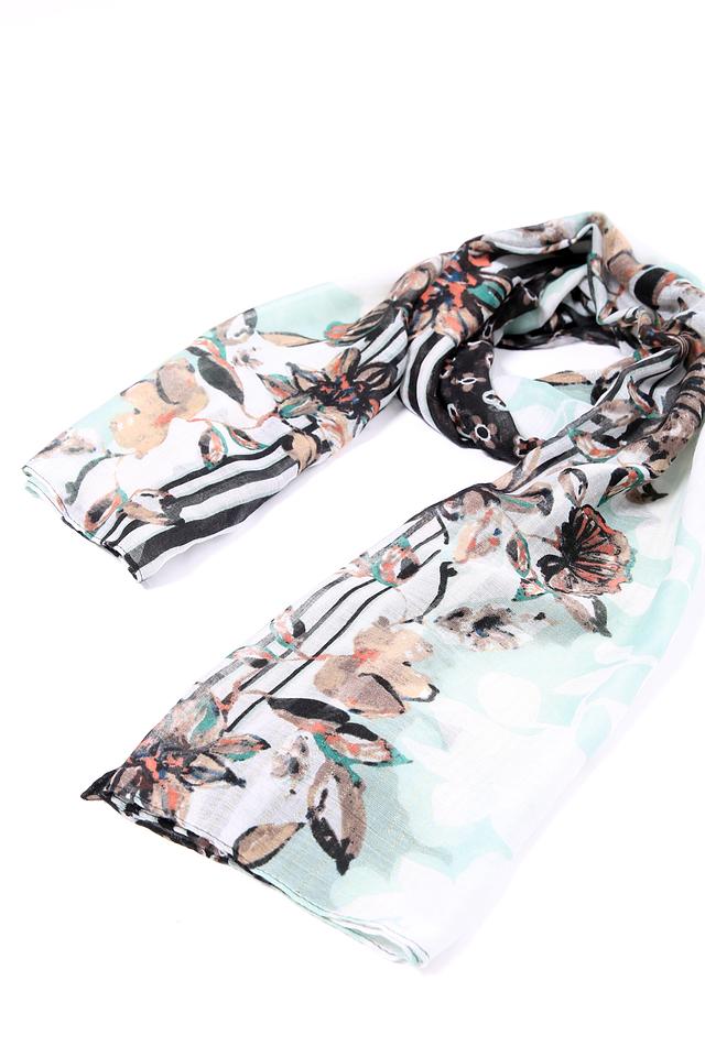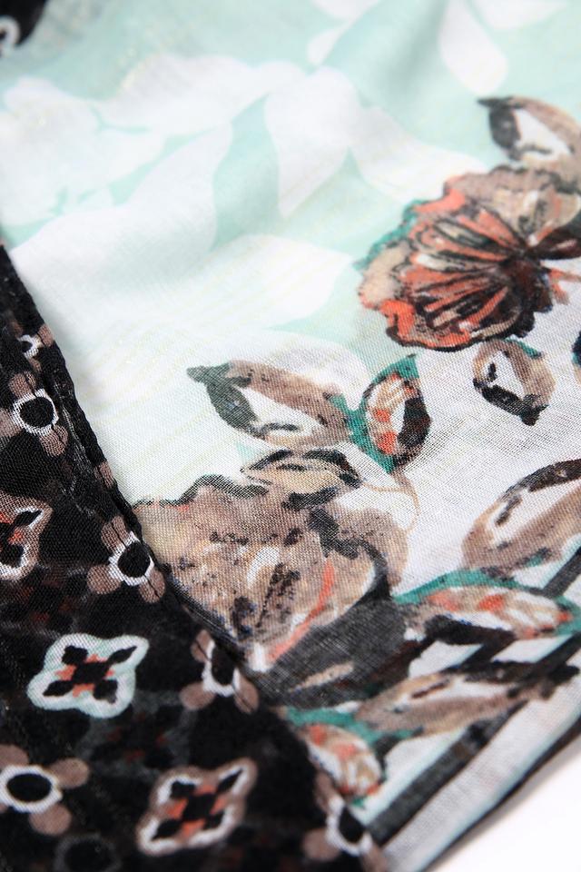 Этот шарф от Gerry Weber – идеальный аксессуар для создания элегантного и женственного образа. Шарф выполнен в нежной светло-голубой цветовой гамме и украшен ярким цветочным принтом, сочетающим в себе оттенки коричневого, бежевого, черного и белого.
