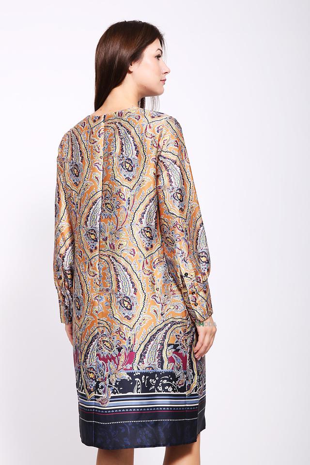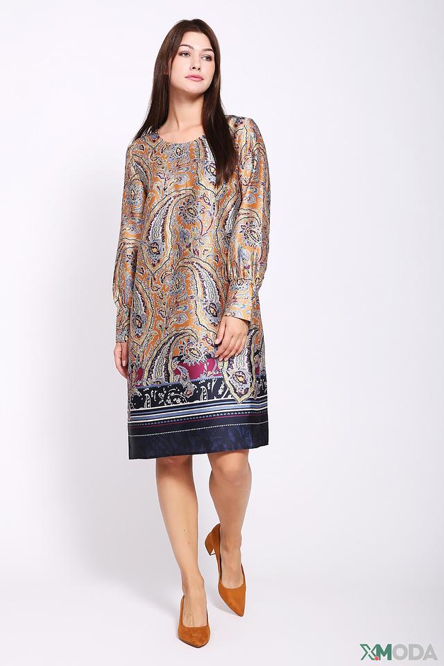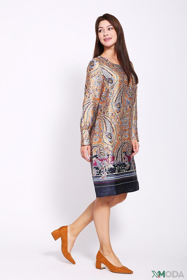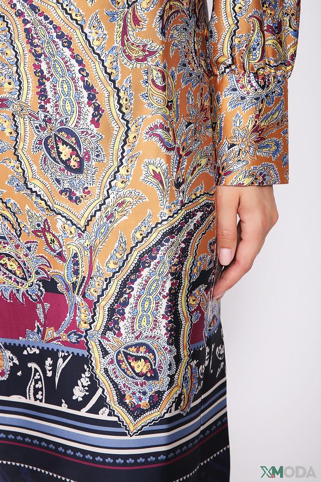 Платье имеет прямой силуэт и длину до колена. Особенностью модели является яркий и оригинальный принт пейсли, выполненный в горчично-коричневой гамме с добавлением синих и бордовых оттенков. Рукава длиной три четверти добавляют образу женственности.