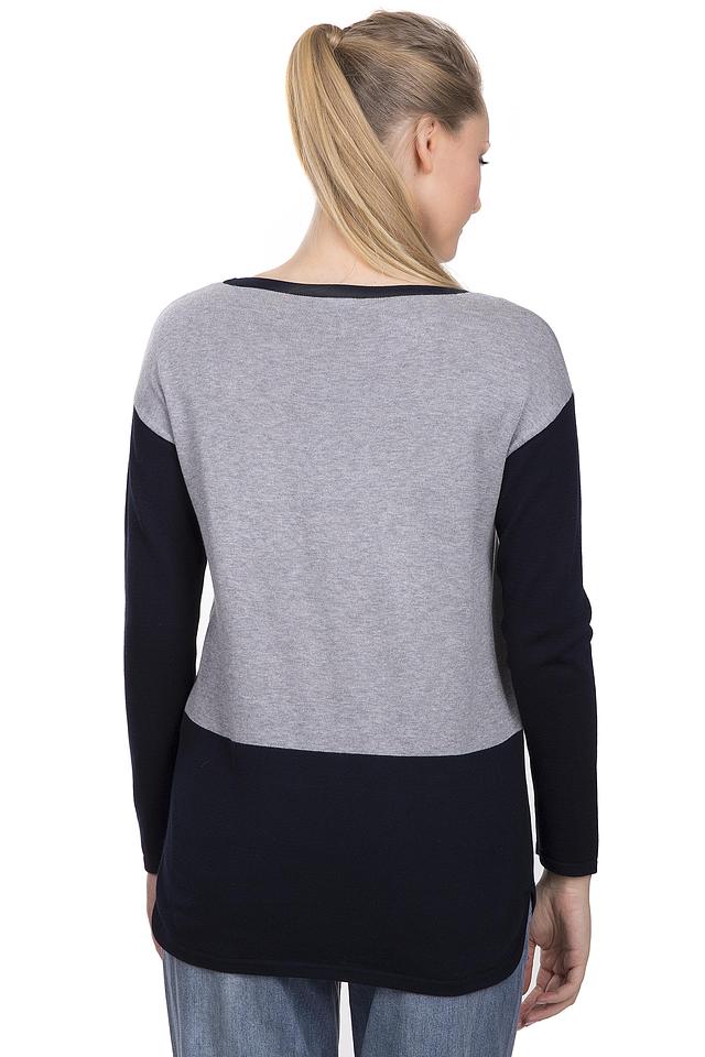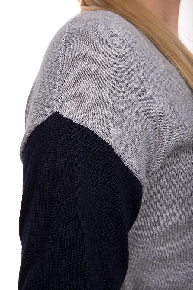 Жакет выполнен из 100% хлопка, что обеспечивает приятные тактильные ощущения и комфорт в носке. Цветовая гамма представлена сочетанием серого и тёмно-синего цветов, создавая эффектный контраст.