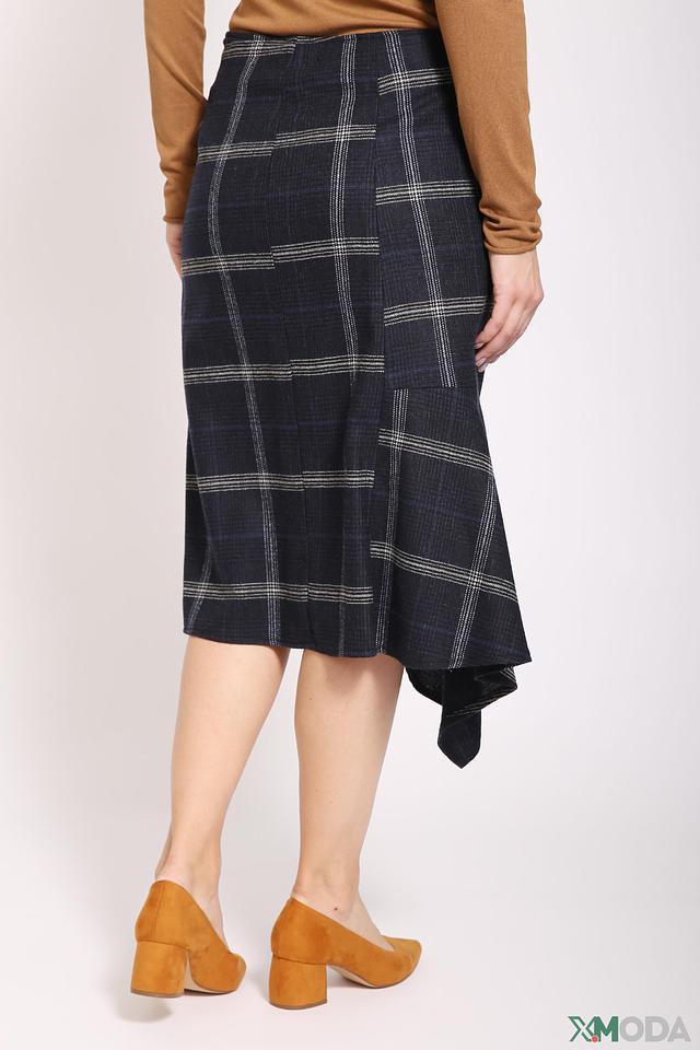 Юбка имеет классический синий цвет с выразительным клетчатым принтом в белых и светло-серых тонах. Асимметричный крой с воланом добавляет образу динамичности и оригинальности. Подкладка из 100% полиамида обеспечивает дополнительный комфорт при носке.