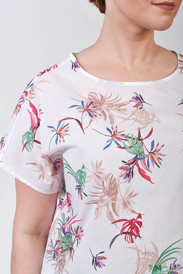 Модель имеет свободный крой, который обеспечивает комфорт в носке. Короткие рукава и округлый вырез горловины делают блузу универсальной и подходящей для различных случаев. Блуза выполнена из 100% хлопка, что делает ее приятной к телу и позволяет коже дышать.