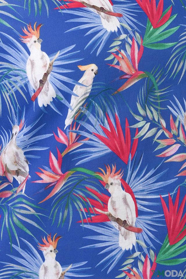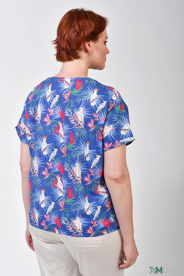 Особенностью этой модели является её уникальный принт с изображением тропических птиц и листьев на синем фоне. Этот яркий и красочный узор добавит вашему образу свежести и оригинальности. Блуза идеально сочетается с брюками, юбками и джинсами, позволяя создавать разнообразные стильные комплекты.