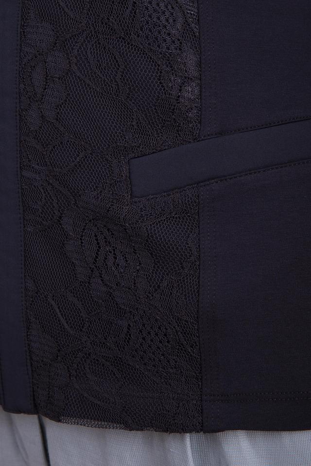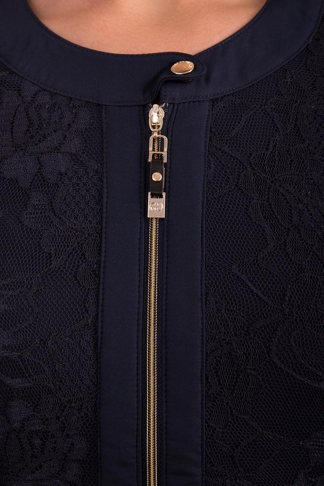 Жакет имеет застежку на молнию золотистого цвета, которая добавляет изысканности. Передняя часть и рукава украшены кружевной отделкой, придающей модели особый шарм. Кружево выполнено в тон основной ткани.
