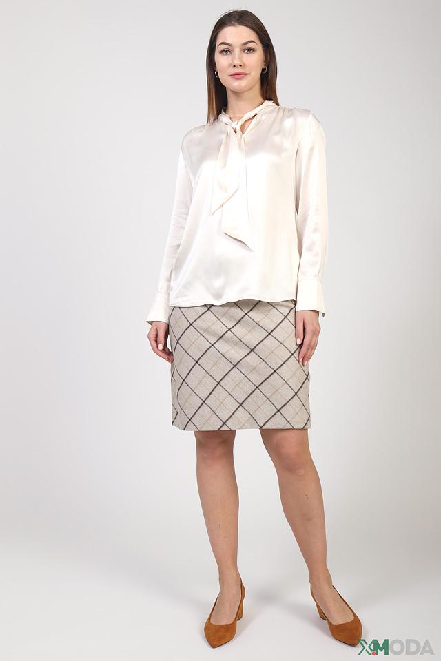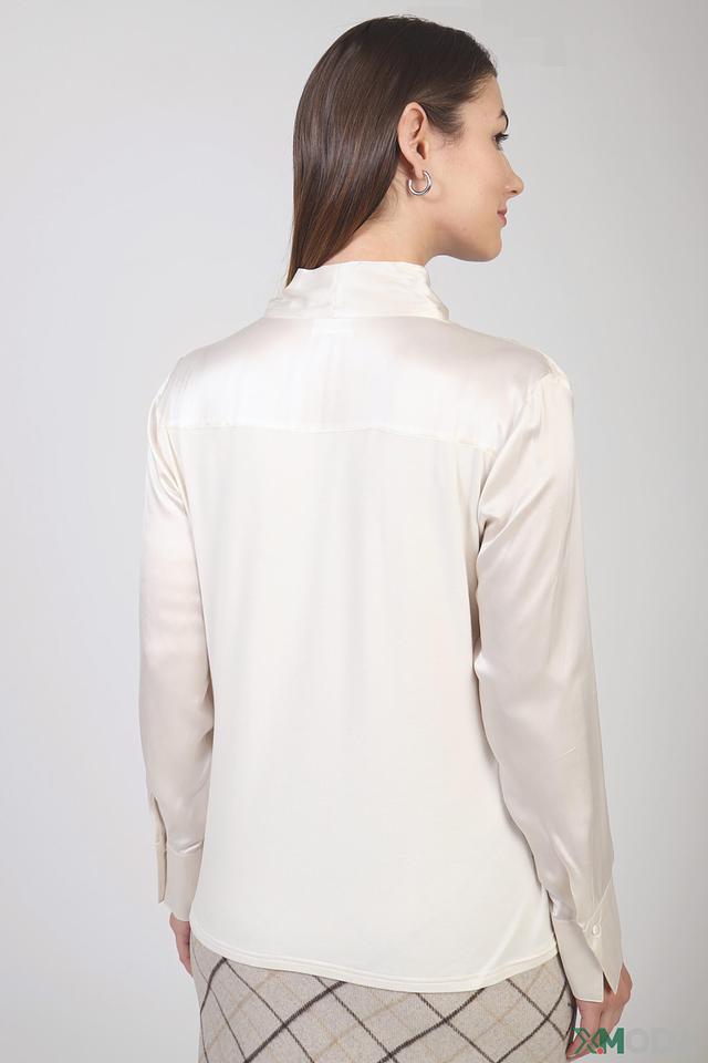 Блуза имеет кремовый оттенок, который легко сочетается с различными элементами гардероба. Отличительной особенностью модели являются завязки на воротнике, которые позволяют создавать различные образы – от классического до более романтичного.