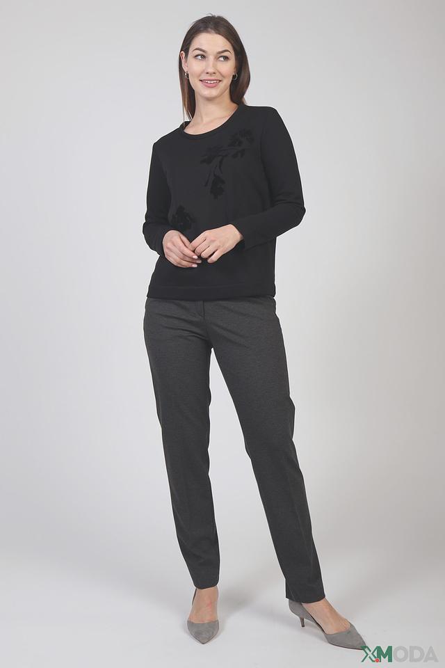 Пуловер имеет классический крой с круглым вырезом горловины и длинными рукавами. Передняя часть украшена элегантным цветочным принтом, который добавляет образу женственности и изысканности. Принт выполнен в тон основной ткани, создавая эффект лёгкой текстуры.