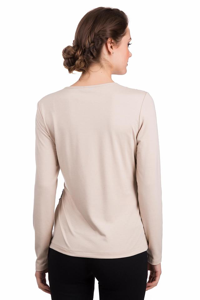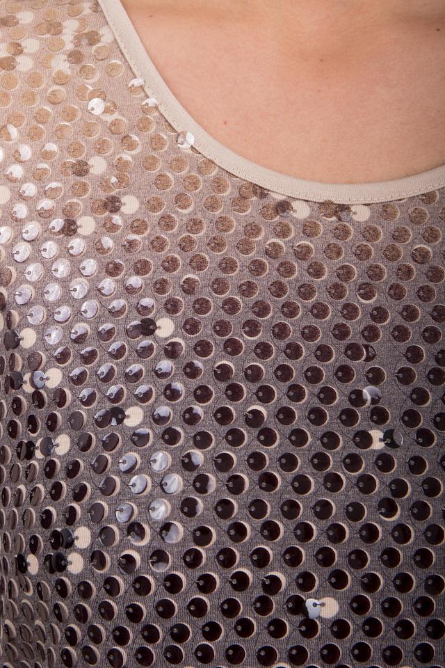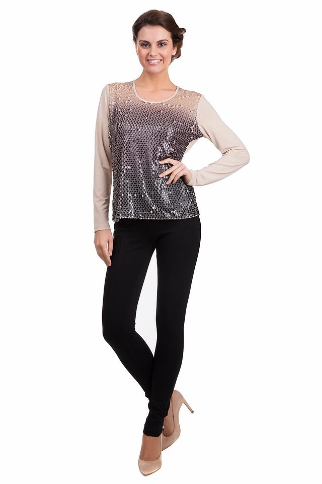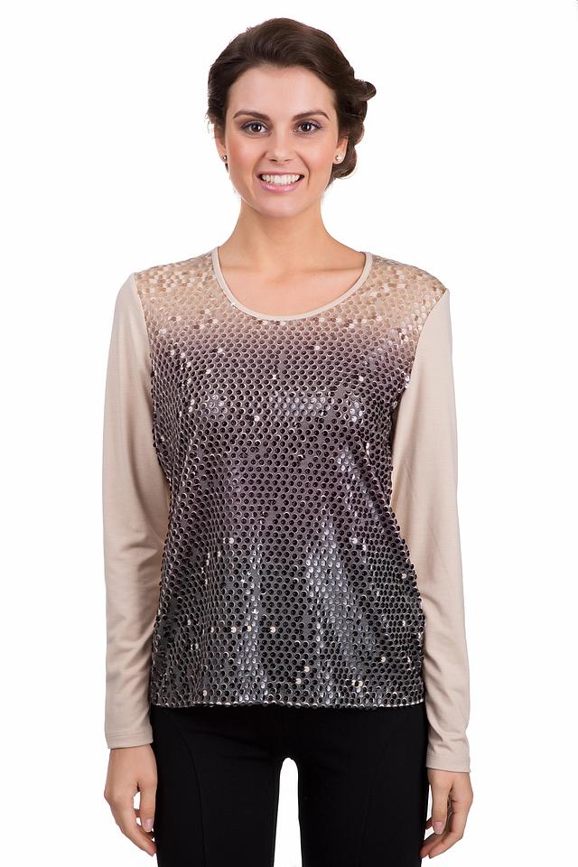 Лицевая сторона лонгслива украшена сверкающими пайетками, создающими плавный градиентный переход цвета от нежного бежево-золотистого в верхней части до глубокого серого внизу. Круглый вырез горловины и классические длинные рукава обеспечивают удобную посадку и универсальность.