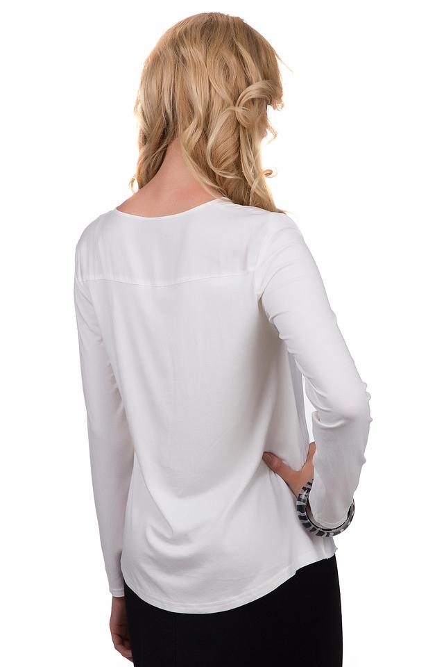 Белая блуза Gerry Weber с длинными рукавами и черной молнией на горловине. Изготовлена из легкой ткани, идеально подходит для создания элегантного и комфортного образа. Состав: полиэстер 100%