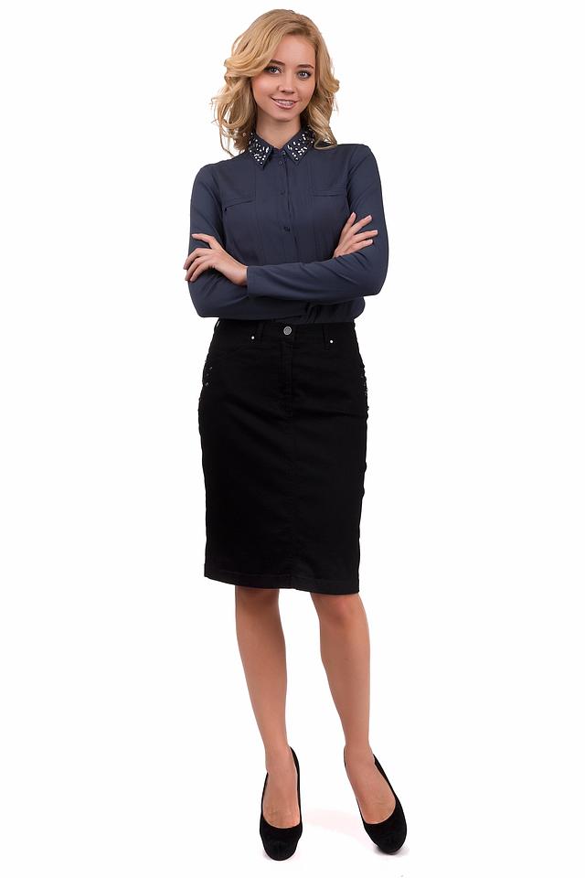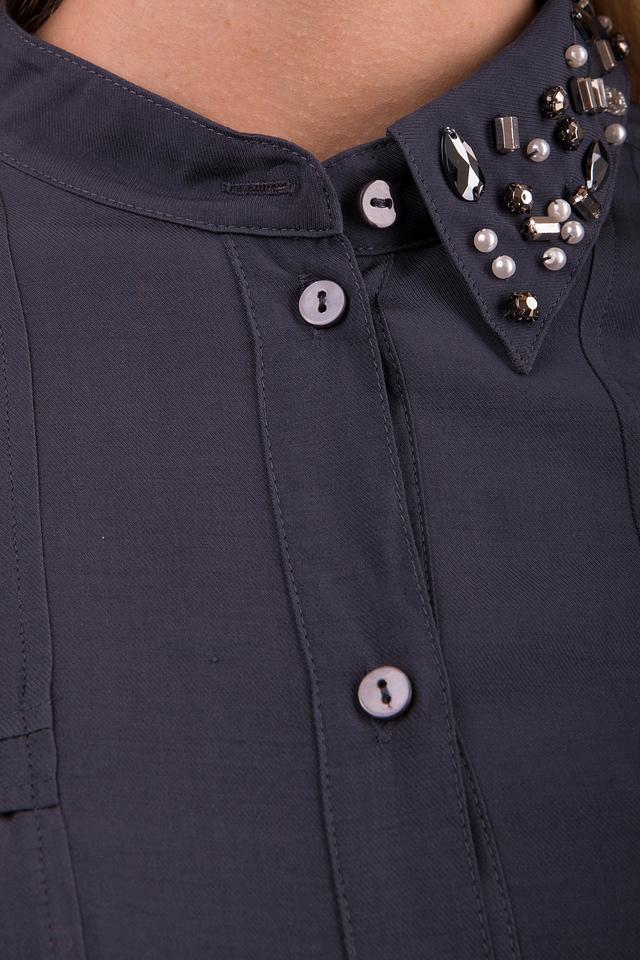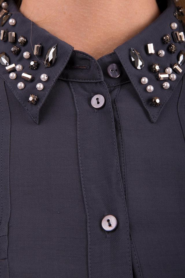 Особенностью данной модели является оригинальный декор воротника, выполненный из бусин и страз, придающий образу изысканность и элегантность. Блуза имеет классический крой с длинными рукавами и застежкой на пуговицы.