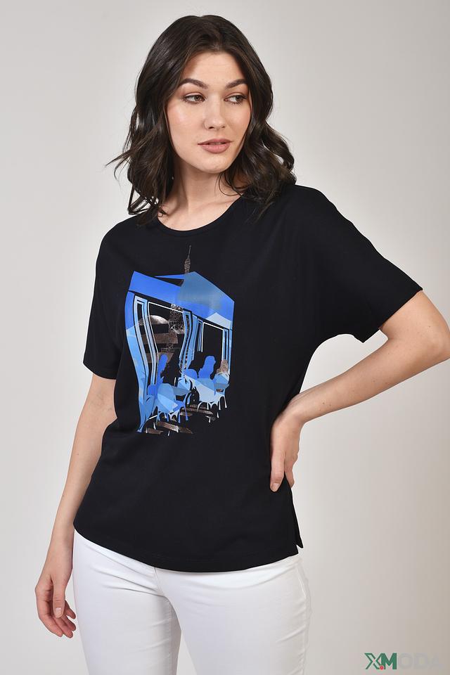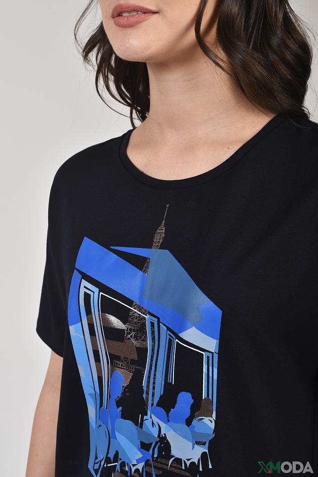 Женская футболка Gerry Weber черного цвета с ярким графичным принтом. Модель свободного кроя из мягкой вискозы с добавлением полиэстера и эластана для комфорта и удобства. Состав: вискоза 62%, полиэстер 35%, эластан 3%