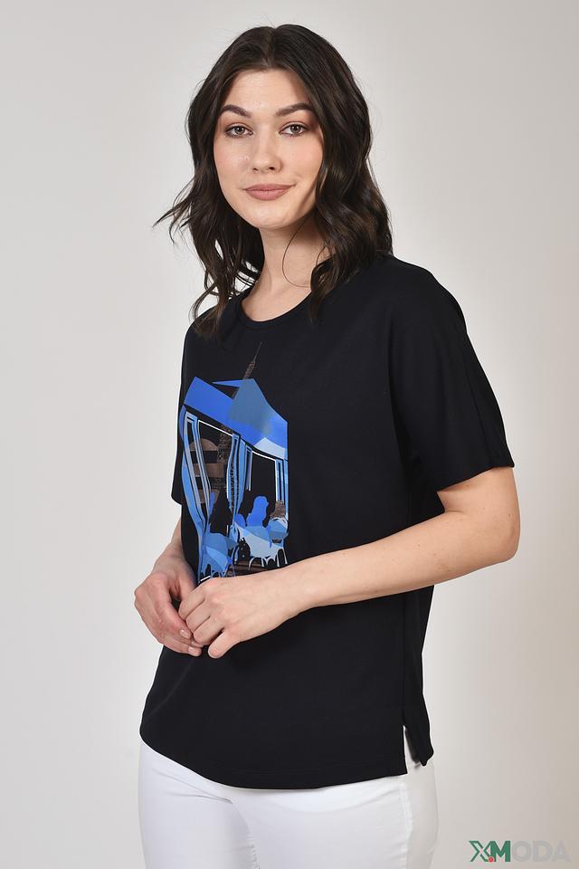 Эта стильная футболка от Gerry Weber станет отличным дополнением к вашему гардеробу. Футболка выполнена в черном цвете и украшена эффектным принтом с изображением архитектурного пейзажа в голубых тонах.