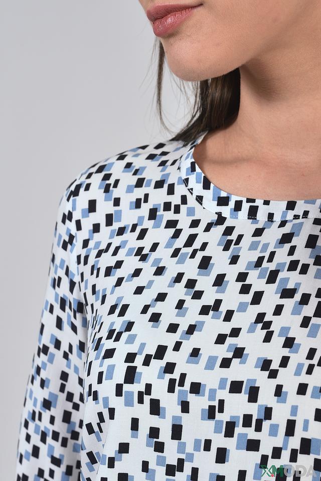 Округлый вырез горловины и рукава длиной 3/4 со сборкой придают блузе женственный и элегантный вид. Принт в виде геометрических фигур в сине-серых тонах на белом фоне делает эту модель особенно привлекательной и универсальной.