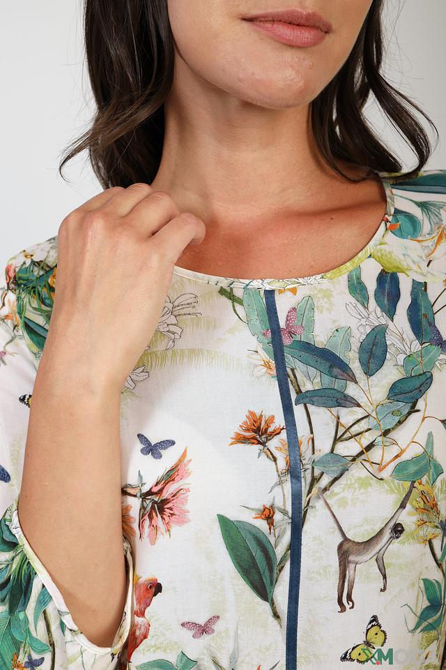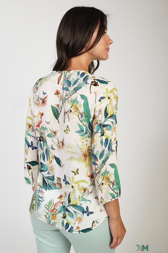 Основной цвет блузы – белый, который служит идеальным фоном для красочного принта. Принт состоит из изображения экзотических птиц, ярких цветов и пышной зелени, создавая тропическую атмосферу.